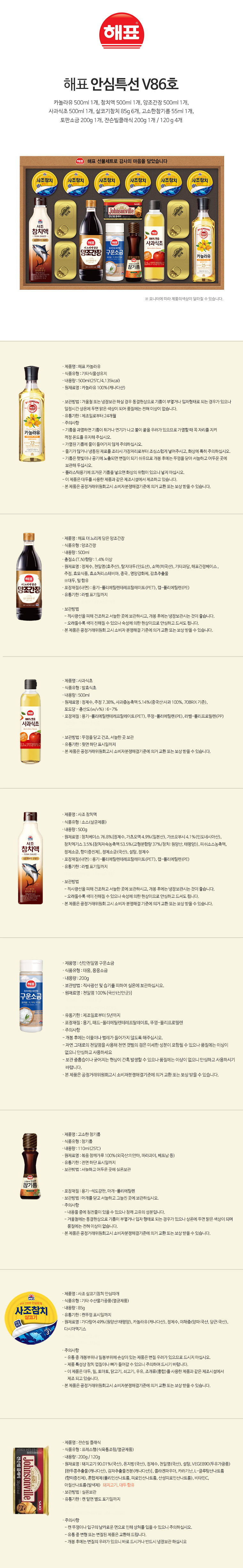 »ìÄÚ±âÂüÄ¡85g¡¿6 + Ä«³î¶óÀ¯500ml¡¿1 + Àò½¼ºôŬ·¡½Ä120g¡¿4 + ÂüÄ¡¾×500g¡¿1 + Àò½¼ºôŬ·¡½Ä200g¡¿1 + Âü±â¸§110ml¡¿1 + ÅäÆÇ¼Ò±Ý200g¡¿1 + »ç°ú½ÄÃÊ500ml¡¿1 + ¾çÁ¶°£Àå500ml¡¿1