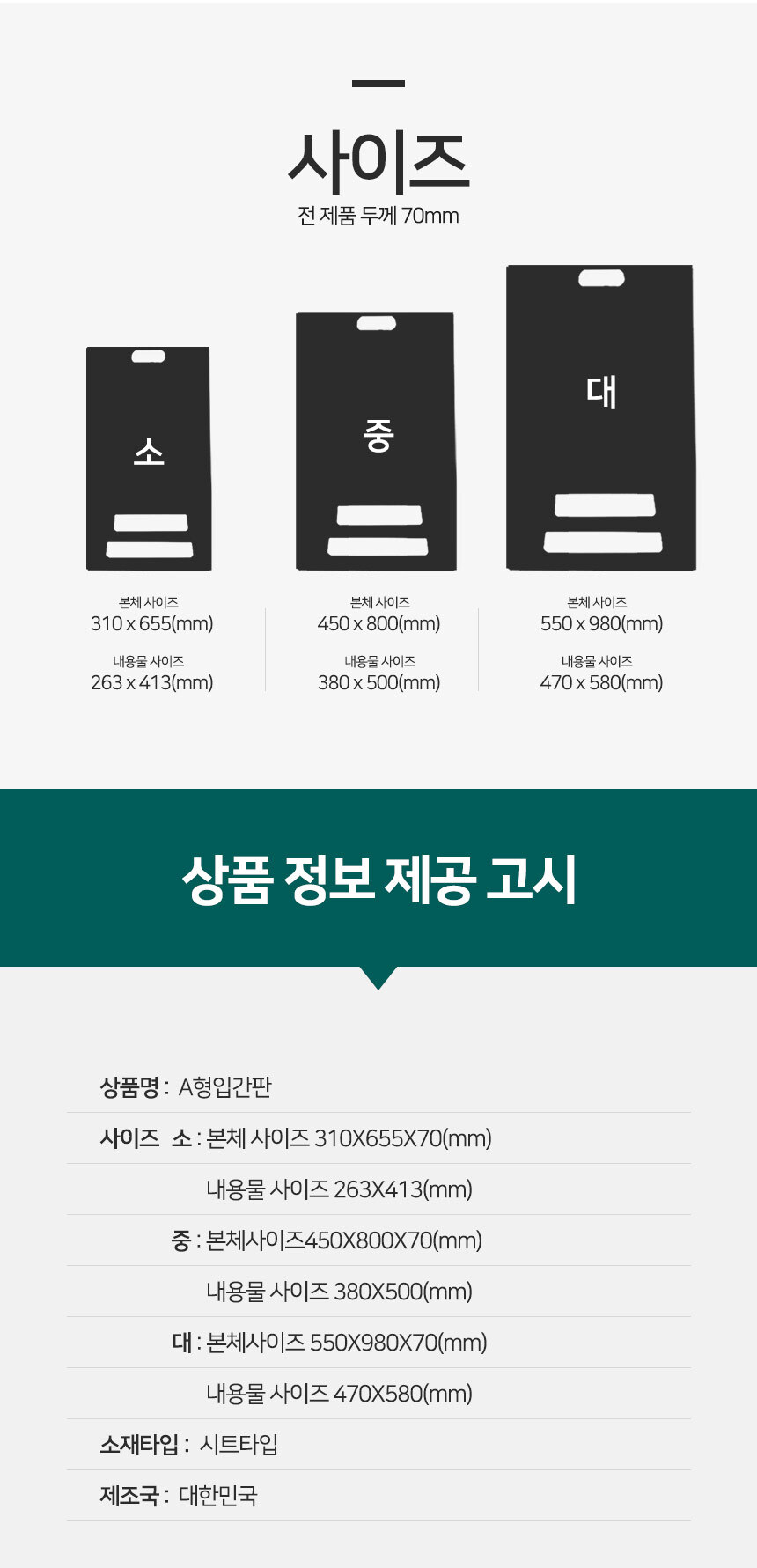 Â÷·® ¿äÀÏÁ¦ AÇü ÀÔ°£ÆÇ ºí·¢ ¼ÒÇü UV¾ç¸é 310X655X70mm